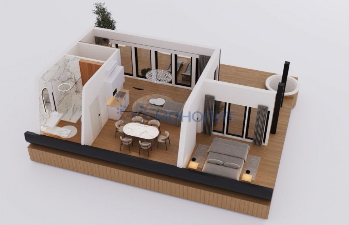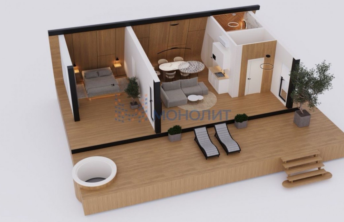 Интерьер — в современном или скандинавском стиле с использованием экологичных материалов (дерево, камень, текстиль нейтральных оттенков).