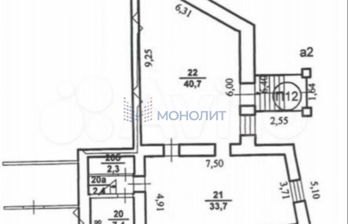 Два больших зала: 34 и 41 м. Кабинеты: 7,4 и 8,2 м. Санузел.