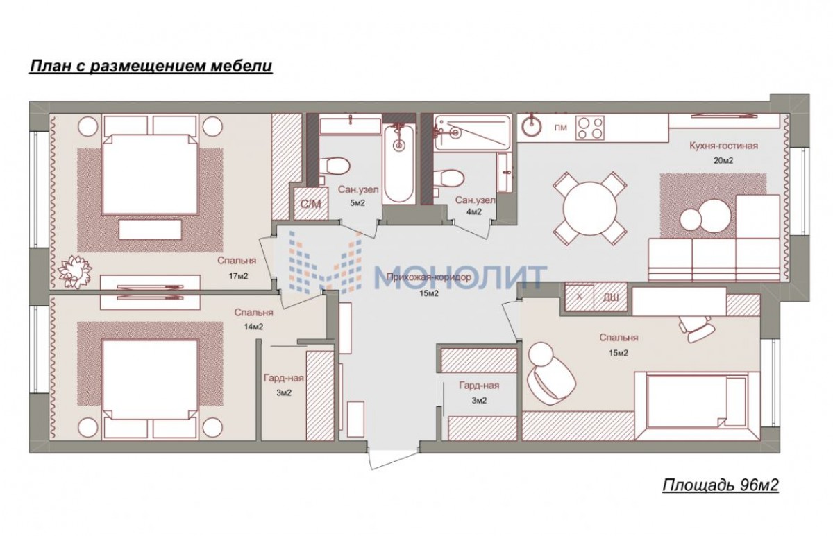 • Общая площадь 96 м².Планировка на три жилые комнаты на две стороны дома: детская 17 м², спальня 16 м² и мастер-спальня, совмещенная с гардеробной 18 м²; просторная кухня-гостиная 19 м² с грамотным разделением зон на столовую и зону семейного отдыха; личный санузел с ванной и гостевой – с душем. Обустройство квартиры мебелью, выполненной на заказ, и полная комплектация техникой.