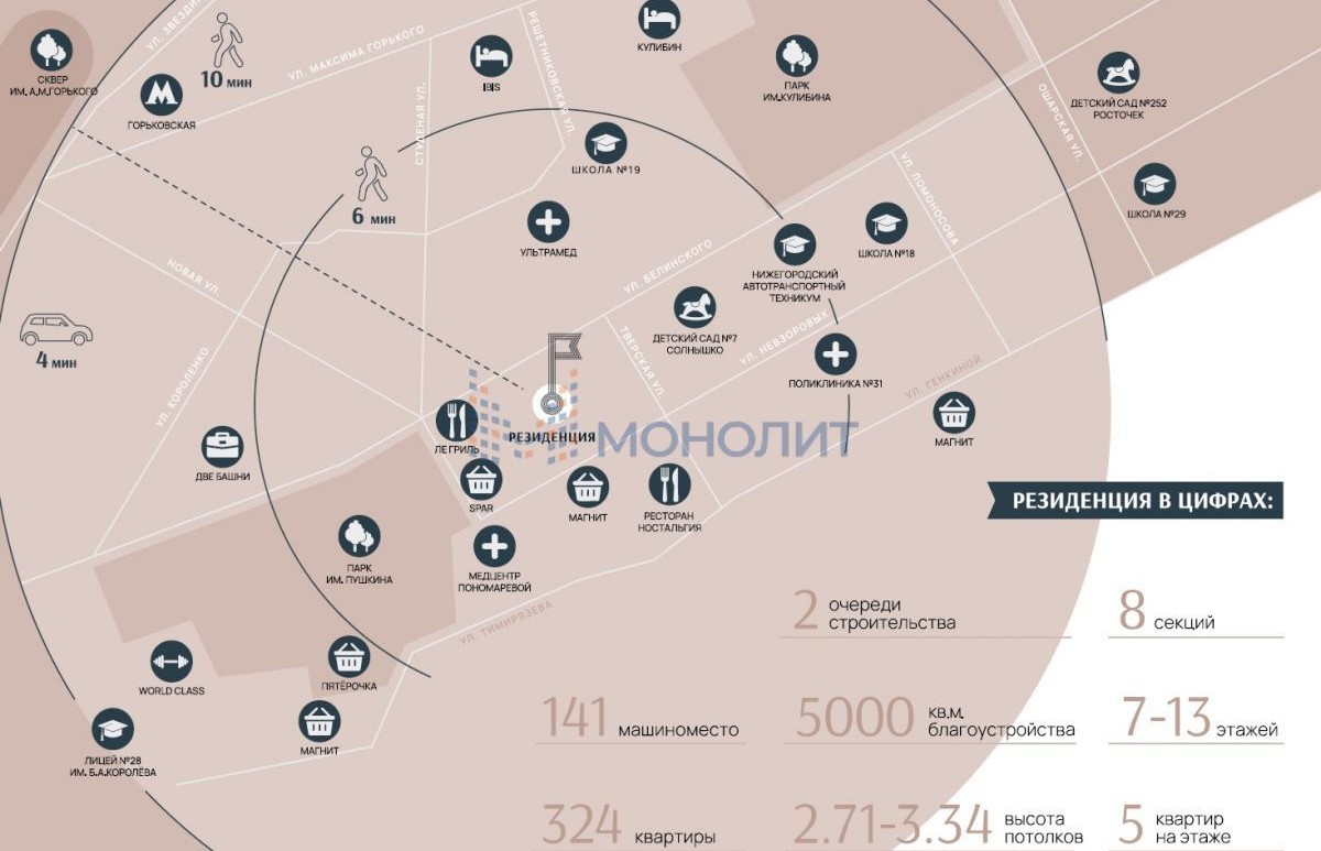 В пешей доступности находятся парки, детские сады и центры, школы, поликлиники, аптеки, торгово-развлекательные центры, фитнес клубы и прочее.