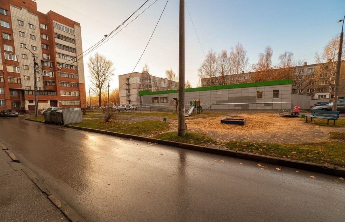Во дворе — детская и спортивная площадки, благоустроенная территория, достаточно места для прогулок с детьми.