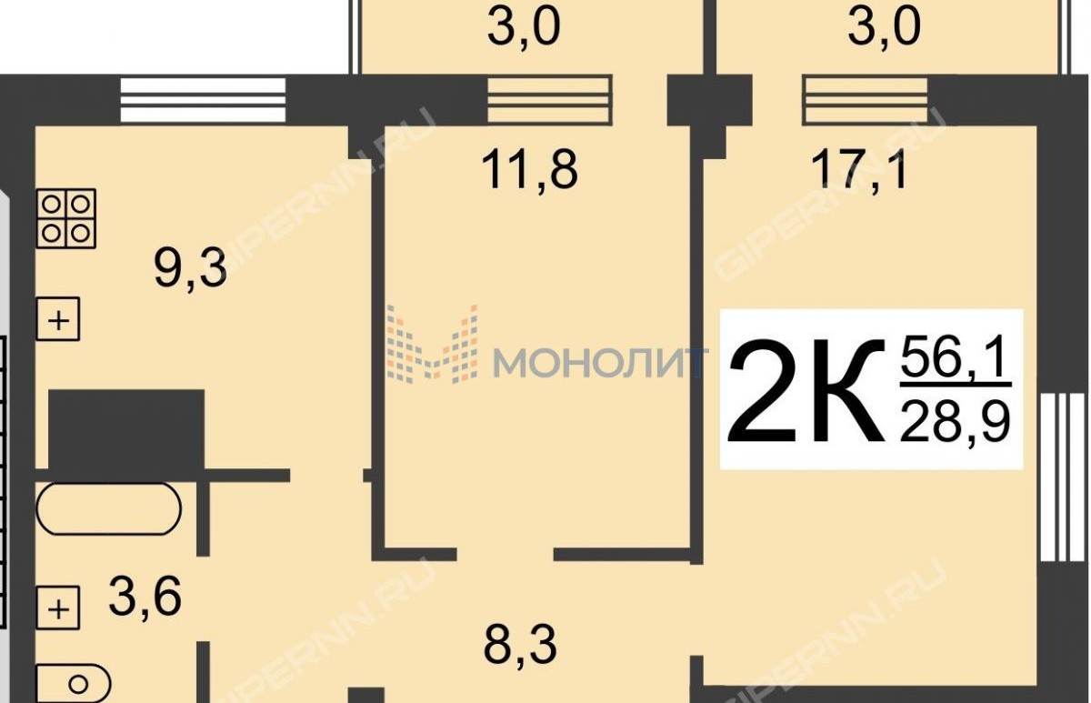 -Общaя площадь 56.1 кв.м.высота потолков 2.7м