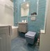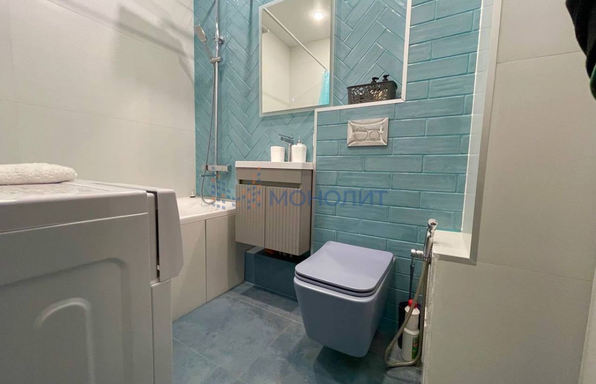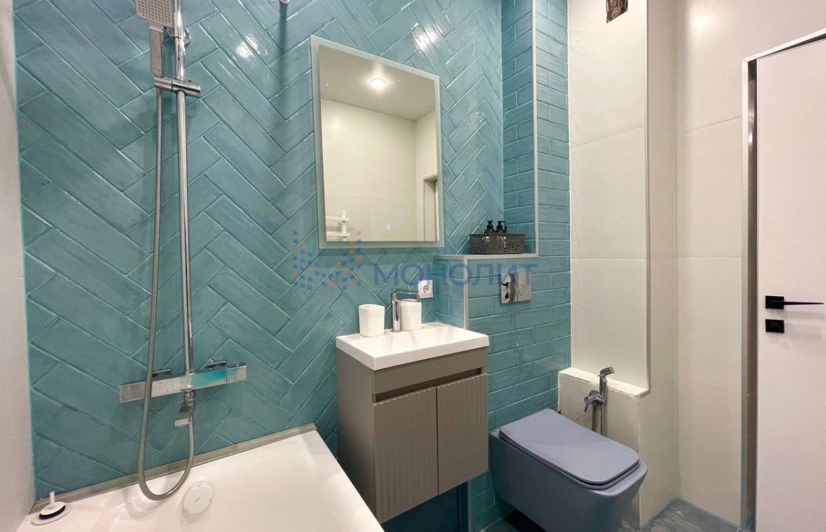 * Совмещённый, в современном кафеле: белые и бирюзовые оттенки, укладка «ёлочкой».