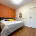 * Акцентная стена тёплого оттенка делает комнату уютной, есть место для шкафа или системы хранения.