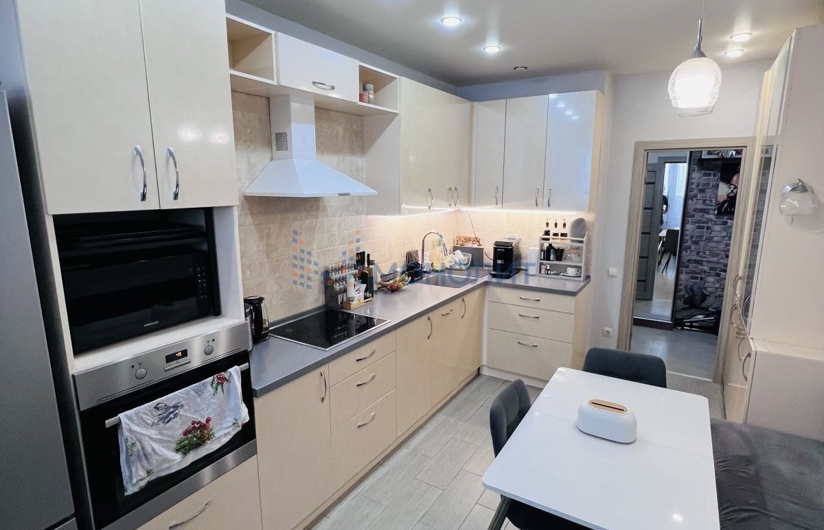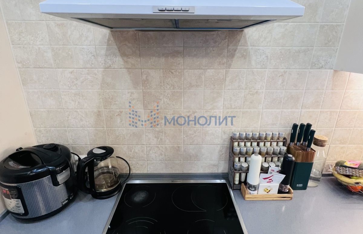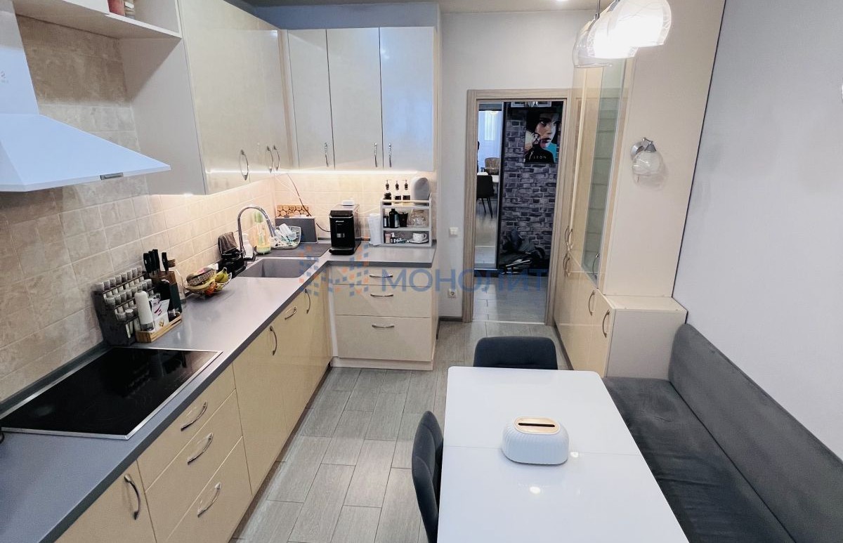 Кухня оснащена кухонным гарнитуром со встроенной варочной поверхностью. Гарнитур с достаточной рабочей поверхностью и достаточным количеством мест хранения.