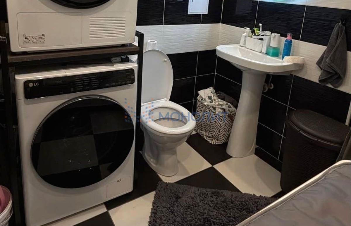 «Домашний SPA» санузел (6,2 м²): Здесь не нужно тесниться! Площадь позволяет с комфортом разместить и полноценную ванную, и стиральную/сушильную машины, и дополнительную мебель. Выполнен в современной плитке.