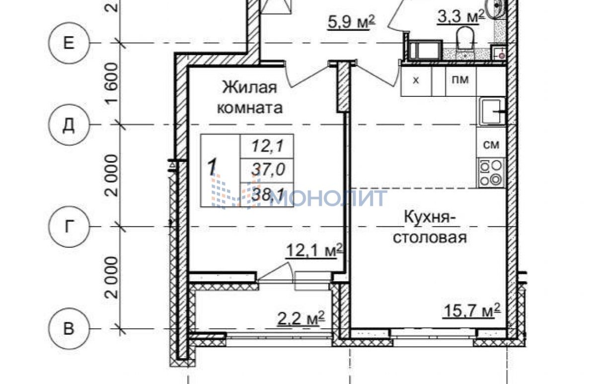 ???? Общая площадь квартиры составляет 38,1 кв.м., при этом кухня-столовая занимает 15,7 кв.м. Просторная комната площадью 12,1 кв.м. позволит создать уютное место для отдыха и работы. Современный санузел с качественной плиткой приятно удивит своим дизайном.