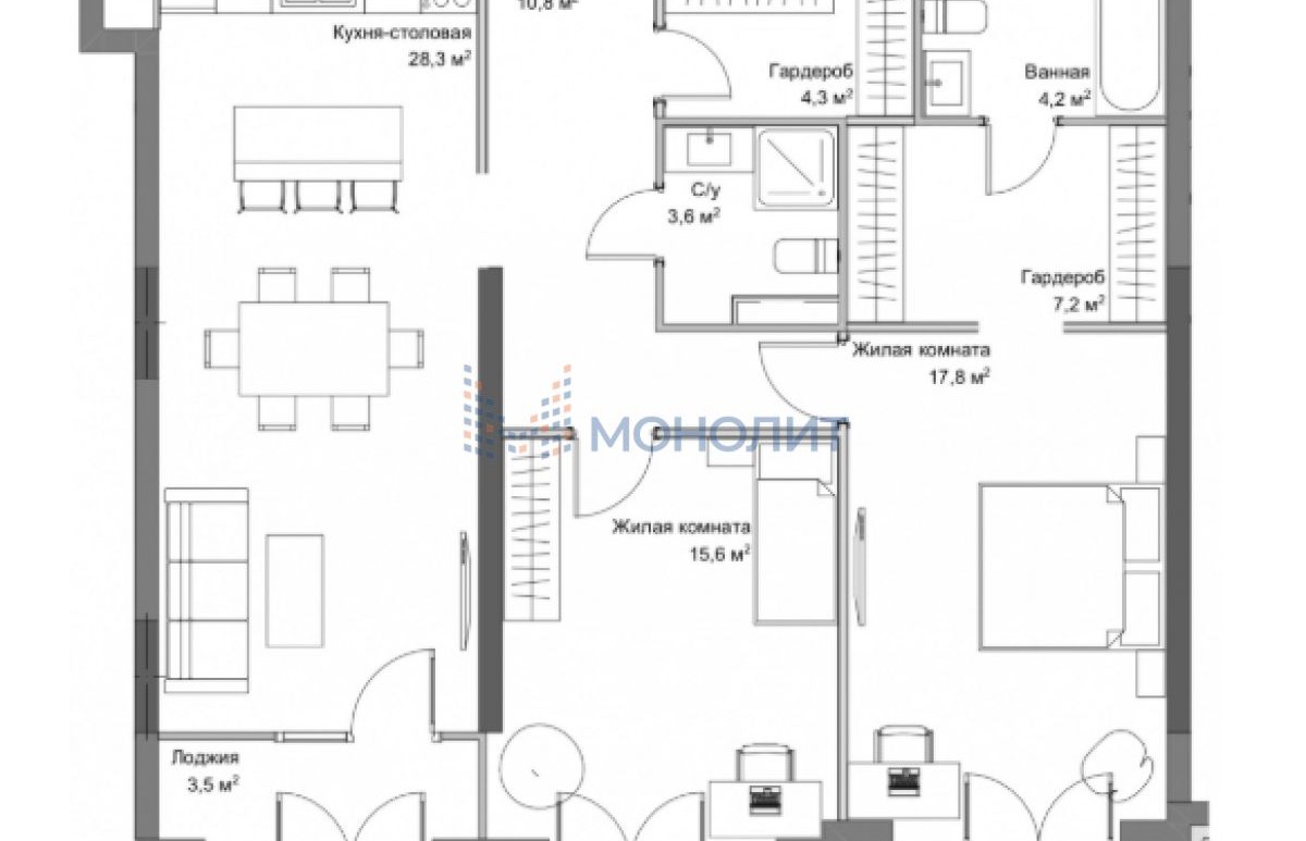 Просторная 2-комнатная квартира в ЖК «Гермес» — 95 м² свободной планировки с тремя балконами и двумя санузлами!