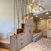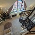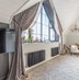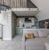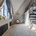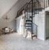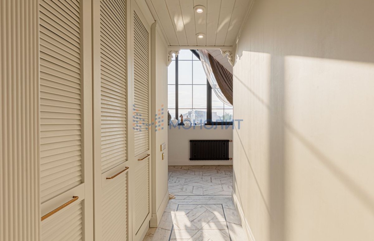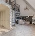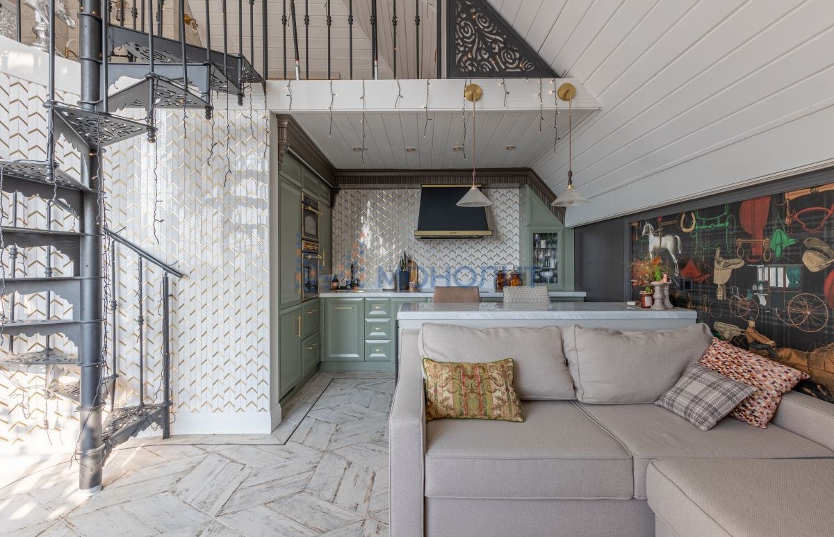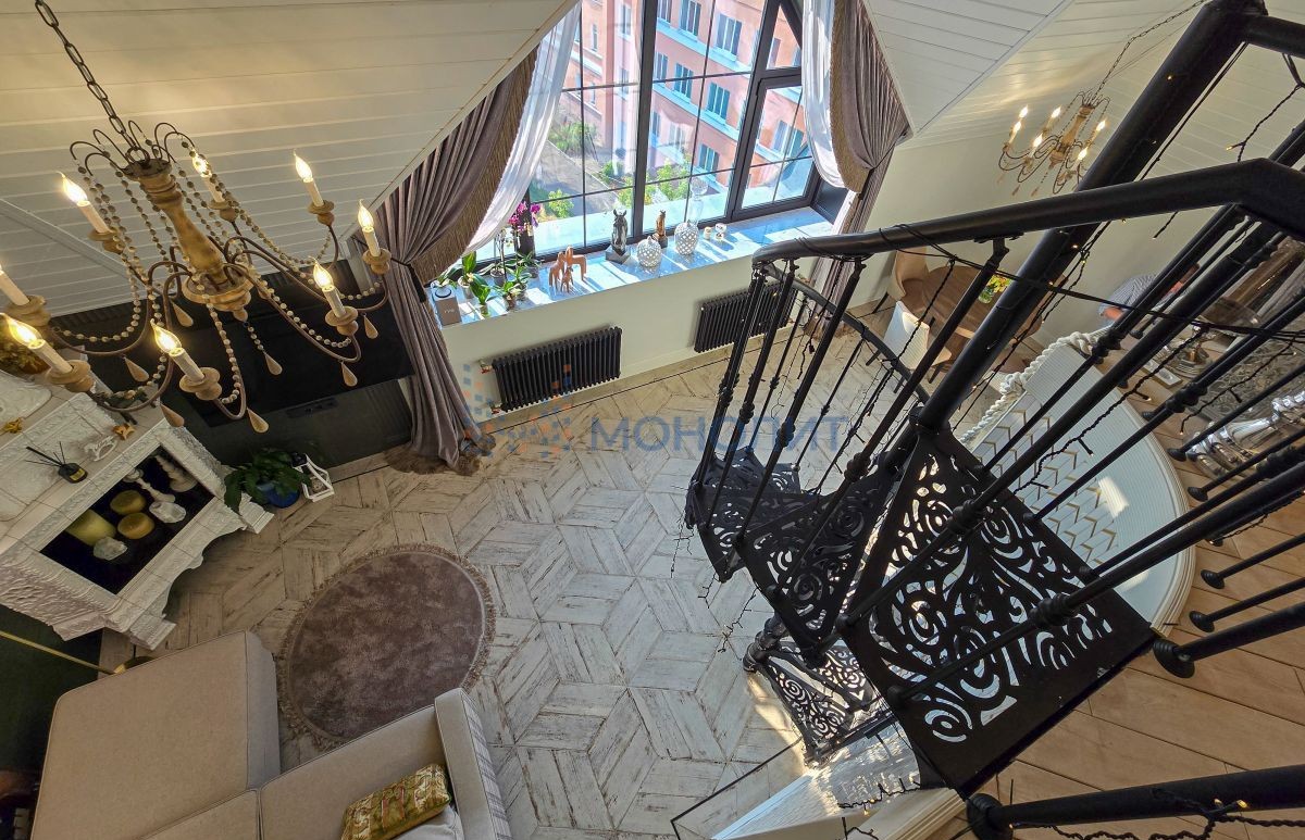 Винтовая лестница соединяет два уровня квартиры под купольными потолками. Большие трапециевидные окна с видом на город и Волгу добавляют масштабную игру натурального света в композицию интерьера.