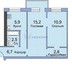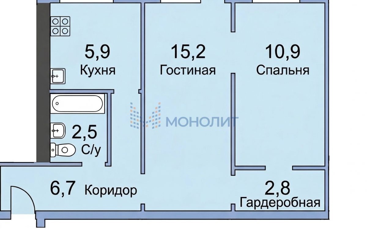 • Общая площадь 44 м², кухня 5.9 м², просторная гостиная 15.2 м², спальная комната 10.9 м²; гардеробная 2.8 м², с/у совмещенный. Квартира укомплектована и готова принять жильцов.