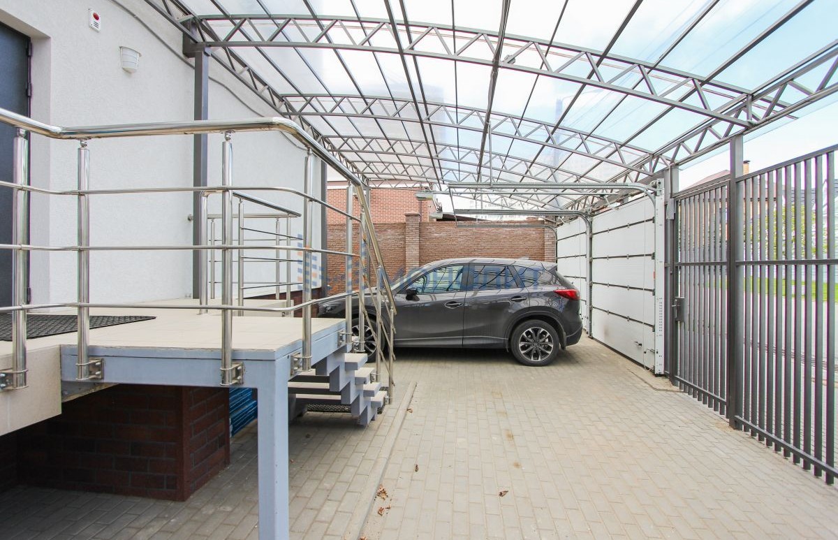 На первом этаже располагается просторная функциональная кухня-столовая с выходом на участок через лоджию с панорамным остеклением, гостиный зал, светлый холл, гостевая спальня/кабинет со своей гардеробной, прихожая и гостевой санузел ванной. Пристроен навес гараж с рольставнями на 2 больших автомобиля + открытый паркинг перед домом. Калитка на магнитном замке и дополнительный забор во-двор дома.