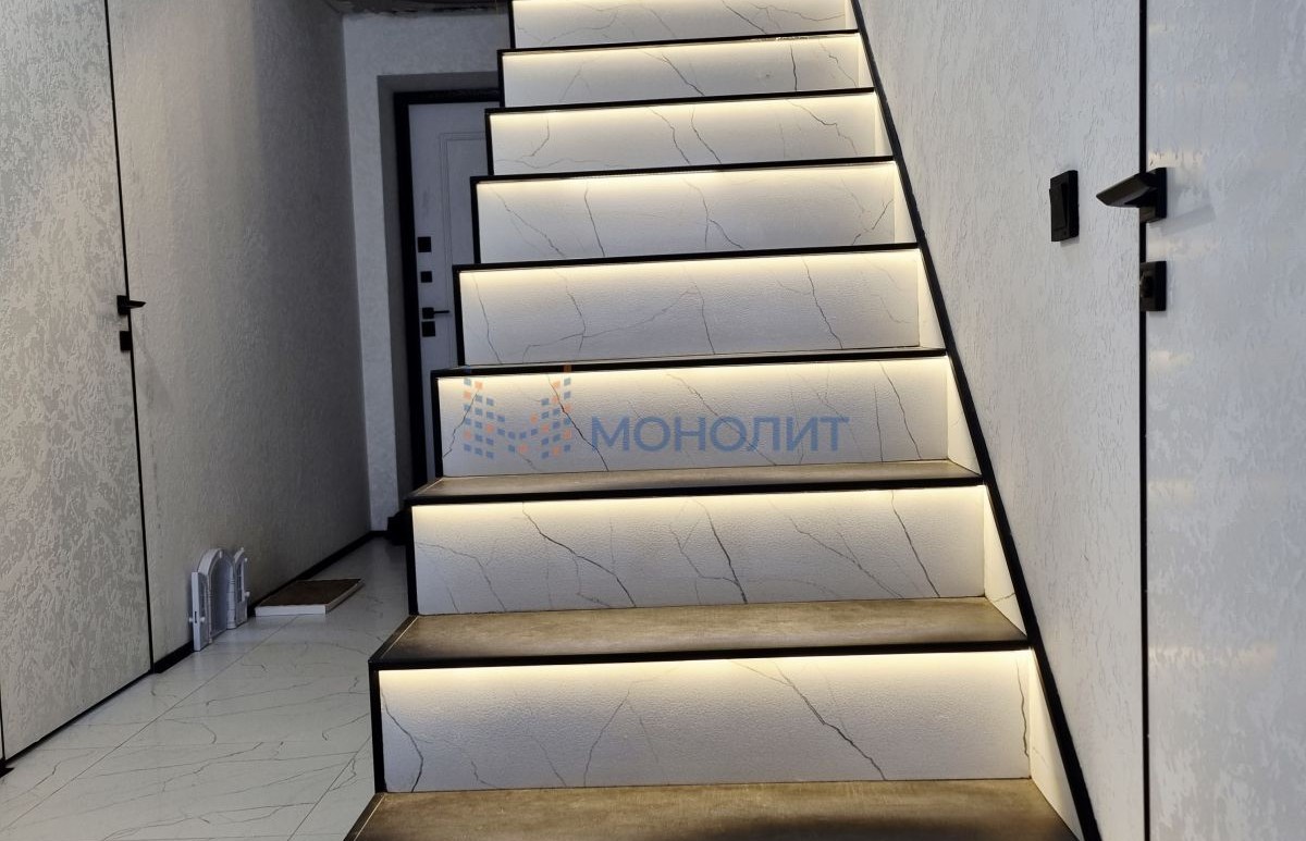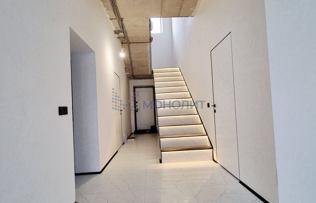 - Первый этаж полностью отделан: плитка/премиум кварц-винил на полах, декоративная штукатурка/краска на стенах , плинтуса, двери скрытого монтажа с итальянской фурнитурой. Монолитная лестница с подсветкой ступеней с датчиком движения.