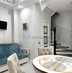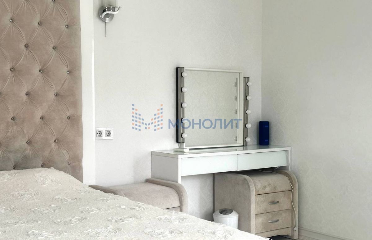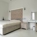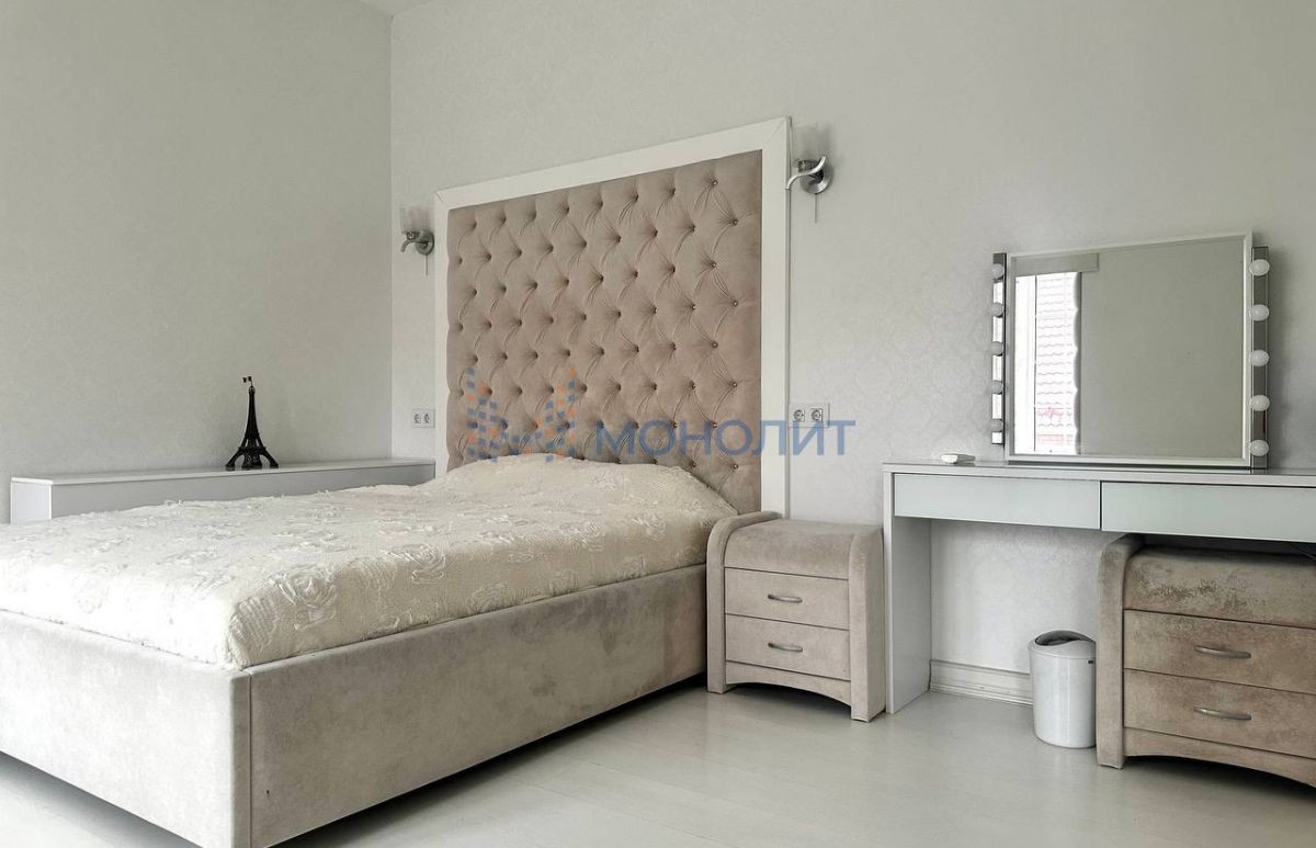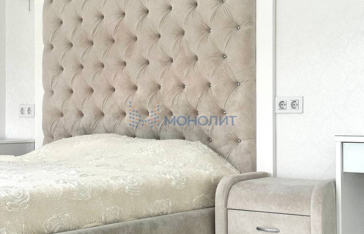 - Спальная комната с шикарной двуспальной кроватью, прикроватными тумбочками, трюмо и мягкий дизайнерский подоконник.