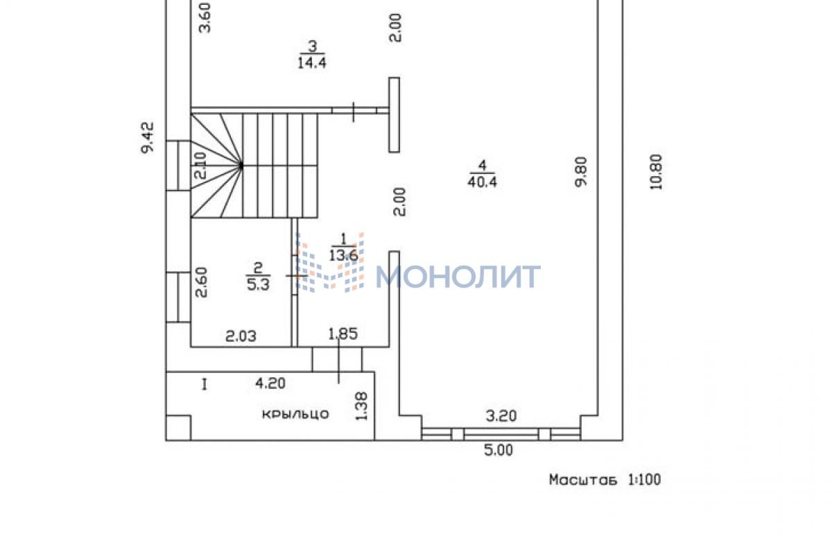 Первый этаж: кухня -14,4 м, гостиная - 40,4 м и санузел - 5,3 м.