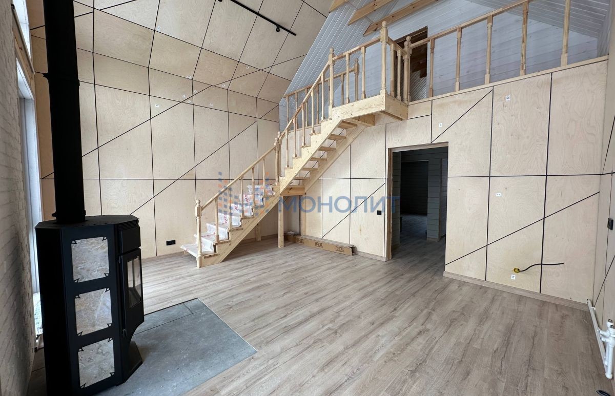 Главная изюминка дома — просторная гостиная со вторым светом и печью-камином.