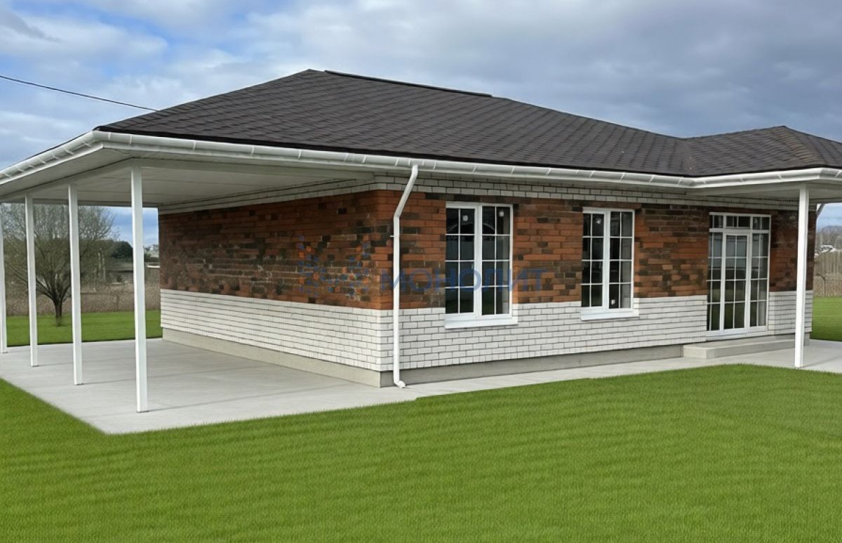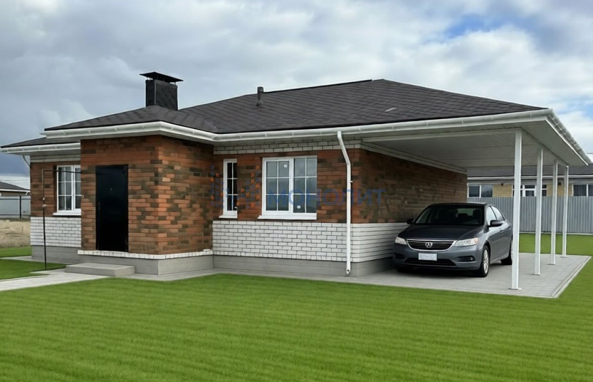 Дополнительно сделан навес под авто, с подготовленной бетонной площадкой. Общая крыша и фундамент под верандой и навесом.