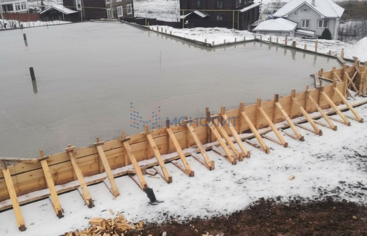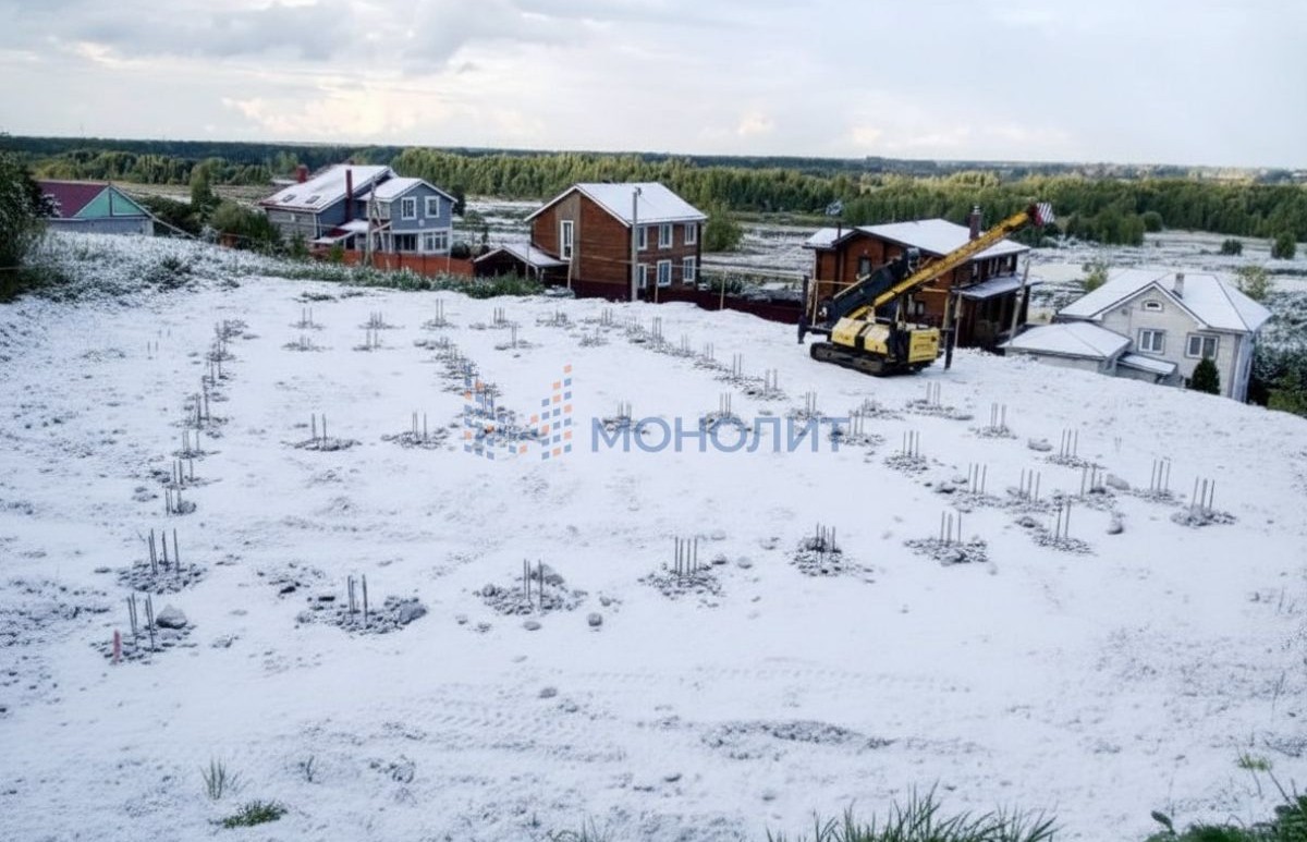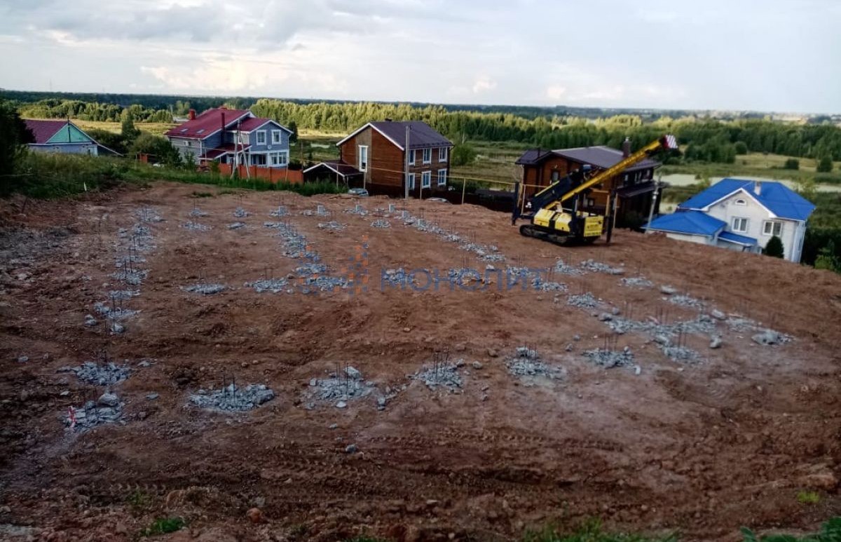 Участок выравнивали. На участке установлен фундамент по индивидуальному проекту: забиты 4х метровые бетонные сваи 20*20 (всего 56 сваи), они сплетены и залиты монолитной плитой. Это очень надежно и безопасно, такой фундамент выдерживает строительство 5-ти этажного дома. На участке установлена бытовка для хранения рабочего инвентаря.